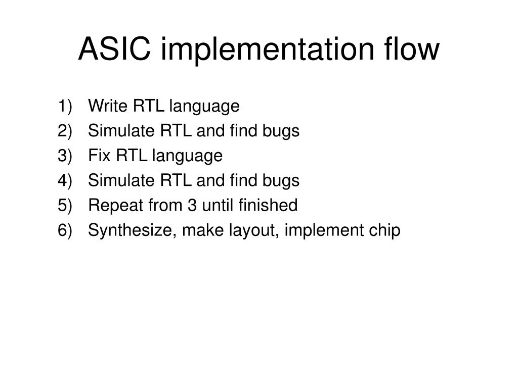 ASIC implementation flow • Write RTL language • Simulate RTL and find bugs • Fix RTL language • Simulate RTL and find bugs • Repeat from 3 until finished • Synthesize, make layout, implement chip