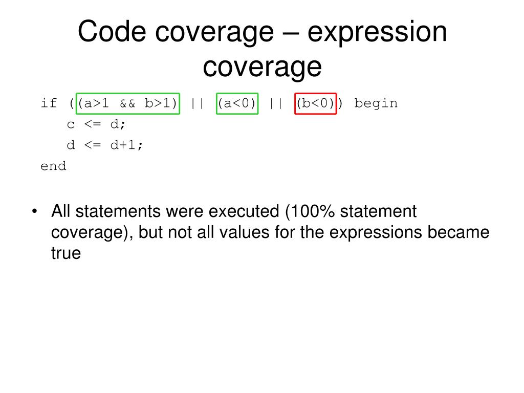 Code coverage – expression coverage if ((a>1 && b>1) || (a<0) || (b<0)) begin c <= d; d <= d+1; end • All statements were executed (100% statement coverage), but not all values for the expressions became true