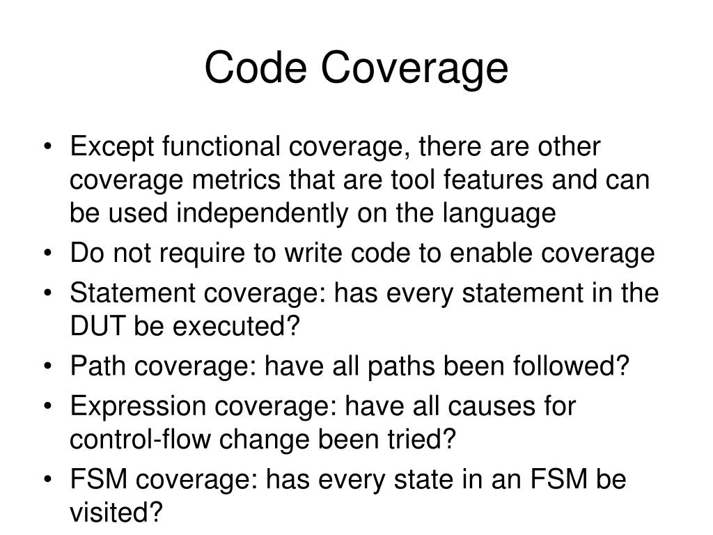 Code Coverage Except functional coverage, there are other coverage metrics that are tool features and can be used independently on the language Do not require to write code to enable coverage Statement coverage: has every statement in the DUT be executed? Path coverage: have all paths been followed? Expression coverage: have all causes for control-flow change been tried? FSM coverage: has every state in an FSM be visited?