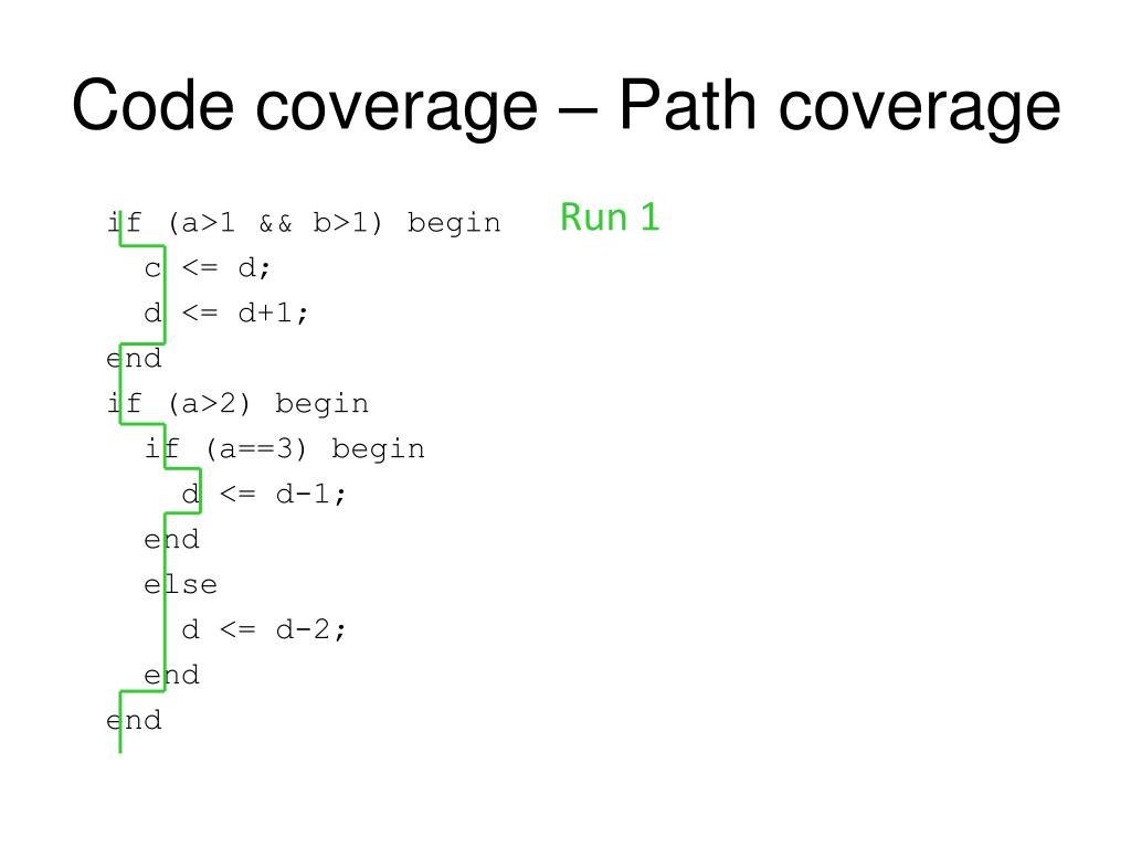 Code coverage – Path coverage Run 1 if (a>1 && b>1) begin c <= d; d <= d+1; end if (a>2) begin if (a==3) begin d <= d-1; end else d <= d-2; end end