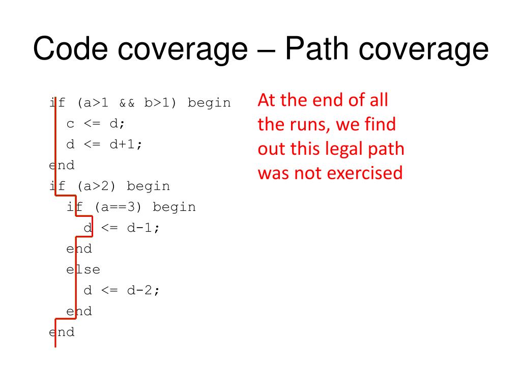 Code coverage – Path coverage At the end of all the runs, we find out this legal path was not exercised if (a>1 && b>1) begin c <= d; d <= d+1; end if (a>2) begin if (a==3) begin d <= d-1; end else d <= d-2; end end