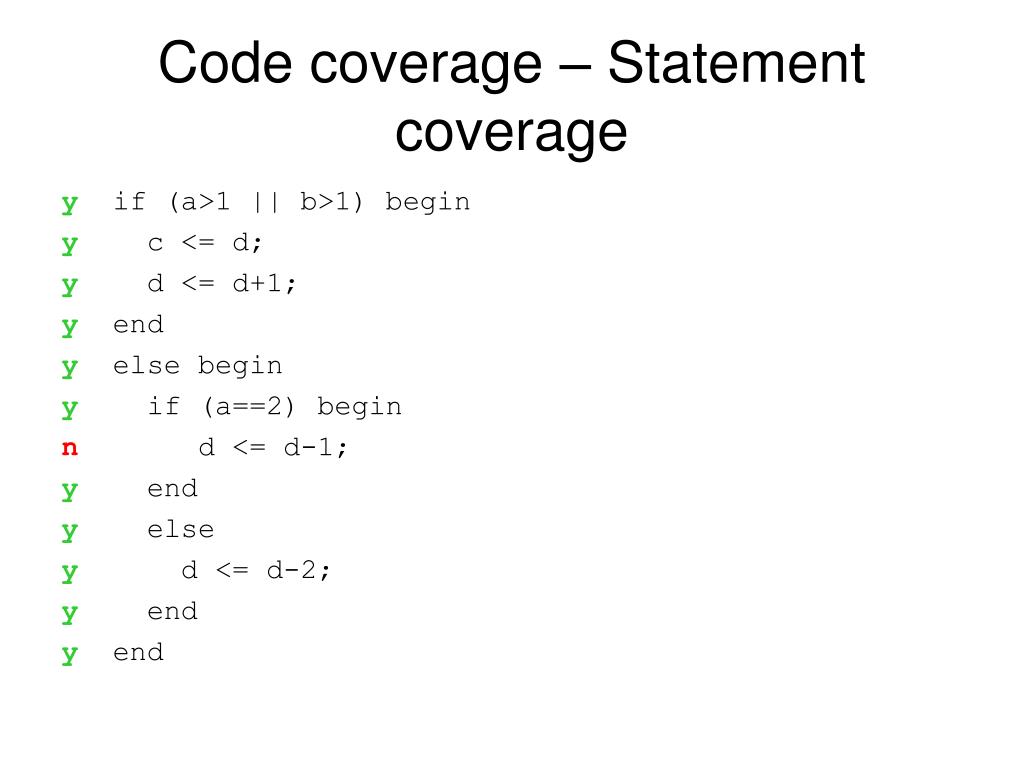 Code coverage – Statement coverage y if (a>1 || b>1) begin y c <= d; y d <= d+1; y end y else begin y if (a==2) begin n d <= d-1; y end y else y d <= d-2; y end y end