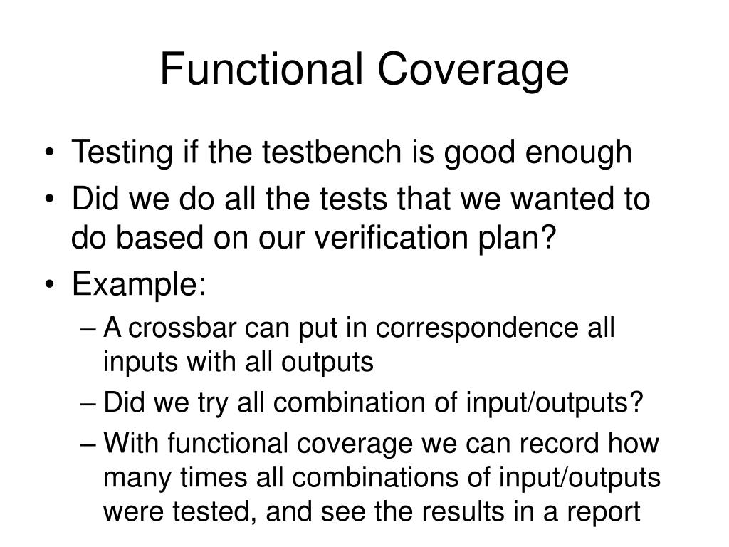 Functional Coverage • Testing if the testbench is good enough • Did we do all the tests that we wanted to do based on our verification plan? • Example: • A crossbar can put in correspondence all inputs with all outputs • Did we try all combination of input/outputs? • With functional coverage we can record how many times all combinations of input/outputs were tested, and see the results in a report