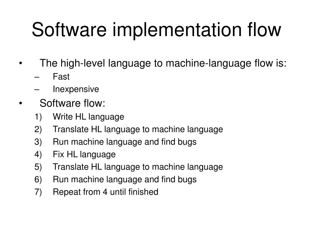 Software implementation flow • The high-level language to machine-language flow is: • Fast • Inexpensive • Software flow: • Write HL language • Translate HL language to machine language • Run machine language and find bugs • Fix HL language • Translate HL language to machine language • Run machine language and find bugs • Repeat from 4 until finished