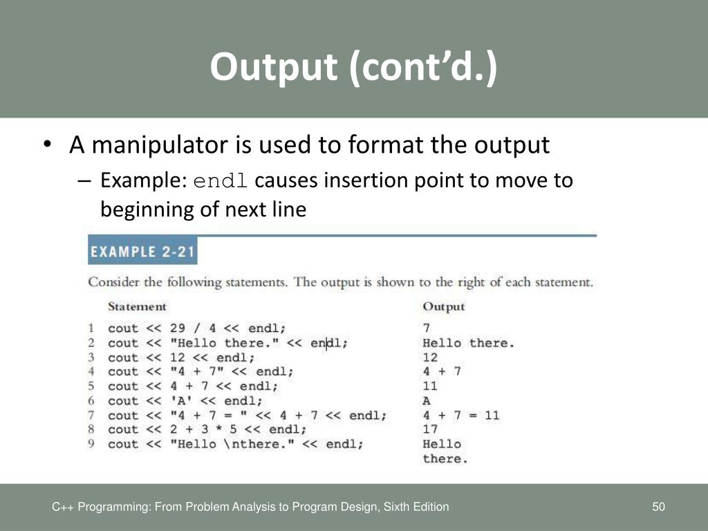 Output (cont’d.) • A manipulator is used to format the output • Example: endl causes insertion point to move to beginning of next line C++ Programming: From Problem Analysis to Program Design, Sixth Edition