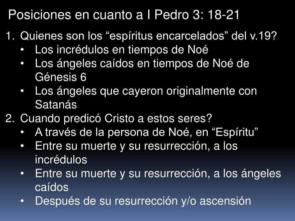 Posiciones en cuanto a I Pedro 3: 18-21 • Quienes son los “espíritus encarcelados” del v.19? • Los incrédulos en tiempos de Noé • Los ángeles caídos en tiempos de Noé de Génesis 6 • Los ángeles que cayeron originalmente con Satanás • Cuando predicó Cristo a estos seres? • A través de la persona de Noé, en “Espíritu” • Entre su muerte y su resurrección, a los incrédulos • Entre su muerte y su resurrección, a los ángeles caídos • Después de su resurrección y/o ascensión