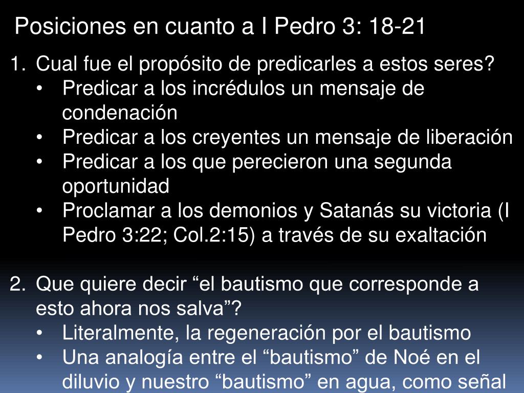 Posiciones en cuanto a I Pedro 3: 18-21 • Cual fue el propósito de predicarles a estos seres? • Predicar a los incrédulos un mensaje de condenación • Predicar a los creyentes un mensaje de liberación • Predicar a los que perecieron una segunda oportunidad • Proclamar a los demonios y Satanás su victoria (I Pedro 3:22; Col.2:15) a través de su exaltación • Que quiere decir “el bautismo que corresponde a esto ahora nos salva”? • Literalmente, la regeneración por el bautismo • Una analogía entre el “bautismo” de Noé en el diluvio y nuestro “bautismo” en agua, como señal