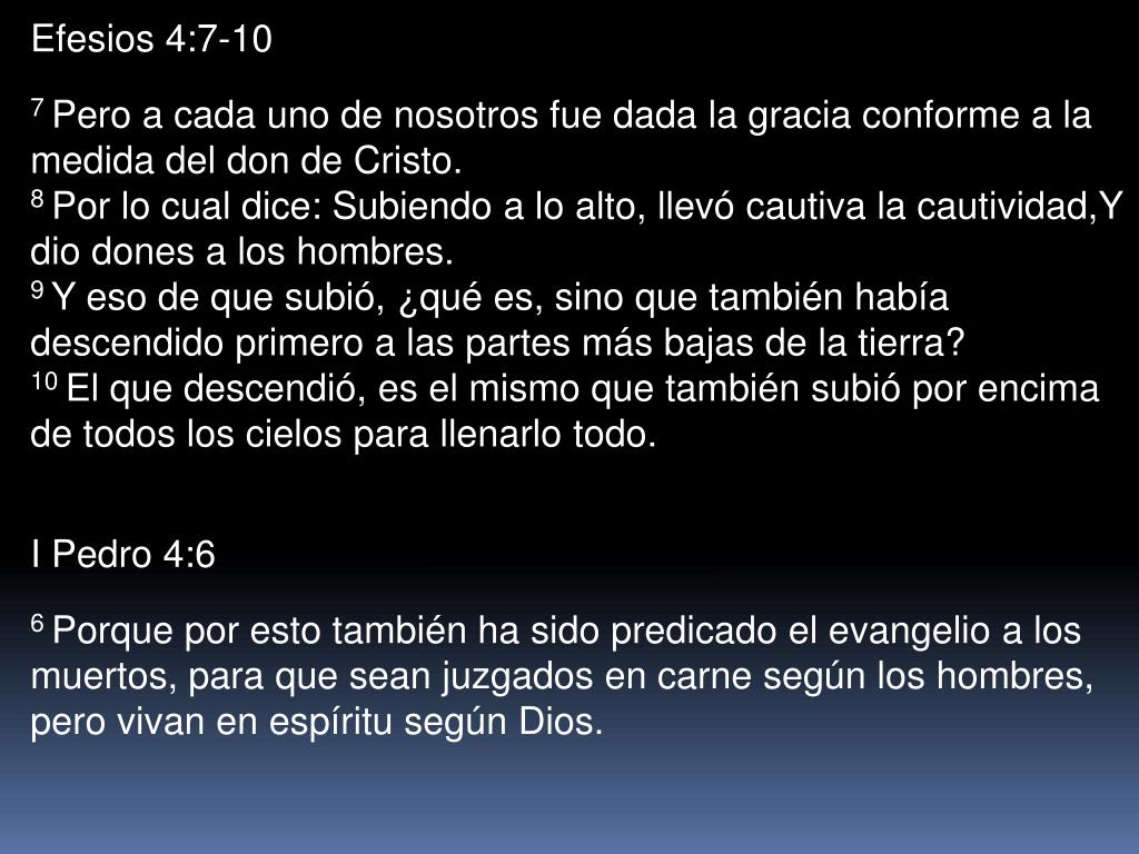 Efesios 4:7-10 7 Pero a cada uno de nosotros fue dada la gracia conforme a la medida del don de Cristo. 8 Por lo cual dice: Subiendo a lo alto, llevó cautiva la cautividad,Y dio dones a los hombres. 9 Y eso de que subió, ¿qué es, sino que también había descendido primero a las partes más bajas de la tierra? 10 El que descendió, es el mismo que también subió por encima de todos los cielos para llenarlo todo. I Pedro 4:6 6 Porque por esto también ha sido predicado el evangelio a los muertos, para que sean juzgados en carne según los hombres, pero vivan en espíritu según Dios.