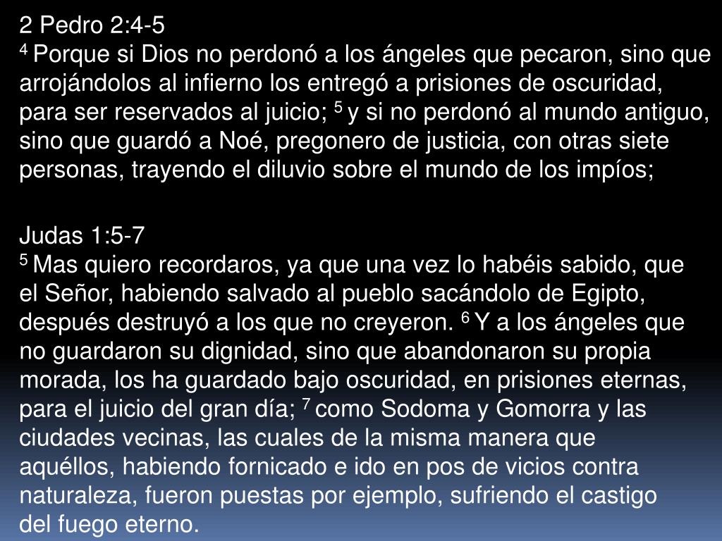 2 Pedro 2:4-5 4 Porque si Dios no perdonó a los ángeles que pecaron, sino que arrojándolos al infierno los entregó a prisiones de oscuridad, para ser reservados al juicio; 5 y si no perdonó al mundo antiguo, sino que guardó a Noé, pregonero de justicia, con otras siete personas, trayendo el diluvio sobre el mundo de los impíos; Judas 1:5-7 5 Mas quiero recordaros, ya que una vez lo habéis sabido, que el Señor, habiendo salvado al pueblo sacándolo de Egipto, después destruyó a los que no creyeron. 6 Y a los ángeles que no guardaron su dignidad, sino que abandonaron su propia morada, los ha guardado bajo oscuridad, en prisiones eternas, para el juicio del gran día; 7 como Sodoma y Gomorra y las ciudades vecinas, las cuales de la misma manera que aquéllos, habiendo fornicado e ido en pos de vicios contra naturaleza, fueron puestas por ejemplo, sufriendo el castigo del fuego eterno.
