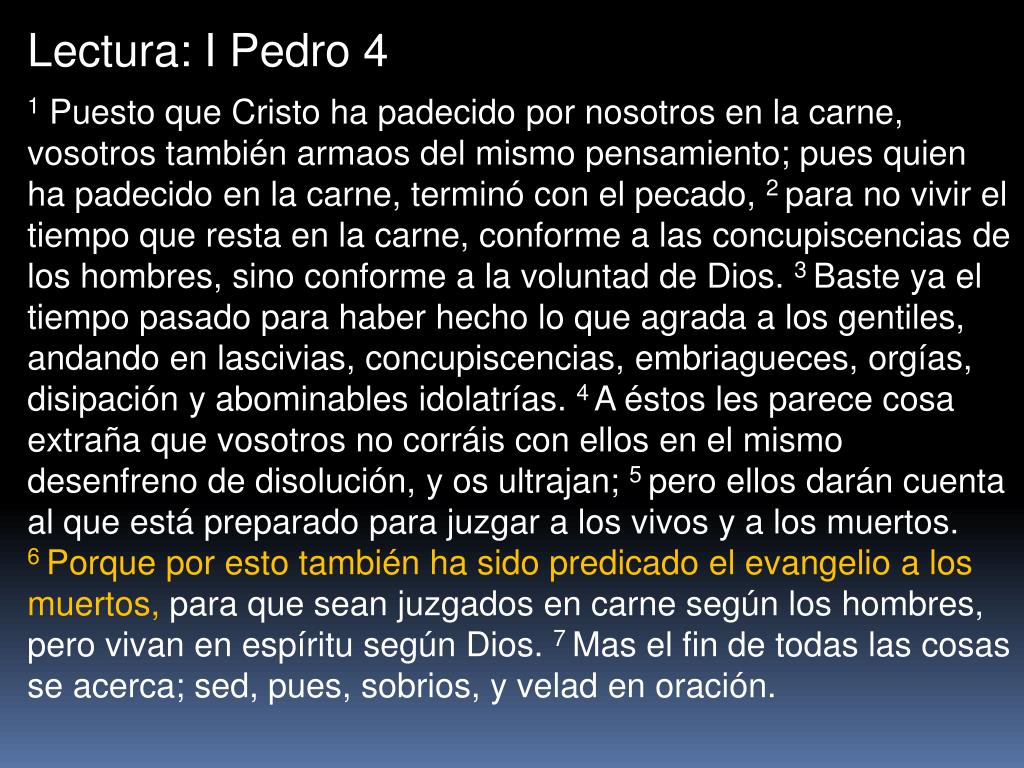 Lectura: I Pedro 4 1 Puesto que Cristo ha padecido por nosotros en la carne, vosotros también armaos del mismo pensamiento; pues quien ha padecido en la carne, terminó con el pecado, 2 para no vivir el tiempo que resta en la carne, conforme a las concupiscencias de los hombres, sino conforme a la voluntad de Dios. 3 Baste ya el tiempo pasado para haber hecho lo que agrada a los gentiles, andando en lascivias, concupiscencias, embriagueces, orgías, disipación y abominables idolatrías. 4 A éstos les parece cosa extraña que vosotros no corráis con ellos en el mismo desenfreno de disolución, y os ultrajan; 5 pero ellos darán cuenta al que está preparado para juzgar a los vivos y a los muertos. 6 Porque por esto también ha sido predicado el evangelio a los muertos, para que sean juzgados en carne según los hombres, pero vivan en espíritu según Dios. 7 Mas el fin de todas las cosas se acerca; sed, pues, sobrios, y velad en oración.