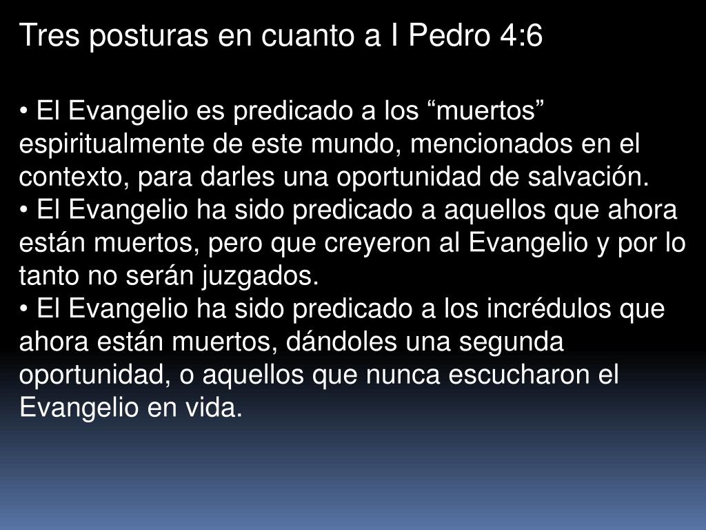 Tres posturas en cuanto a I Pedro 4:6 • El Evangelio es predicado a los “muertos” espiritualmente de este mundo, mencionados en el contexto, para darles una oportunidad de salvación. • El Evangelio ha sido predicado a aquellos que ahora están muertos, pero que creyeron al Evangelio y por lo tanto no serán juzgados. • El Evangelio ha sido predicado a los incrédulos que ahora están muertos, dándoles una segunda oportunidad, o aquellos que nunca escucharon el Evangelio en vida.