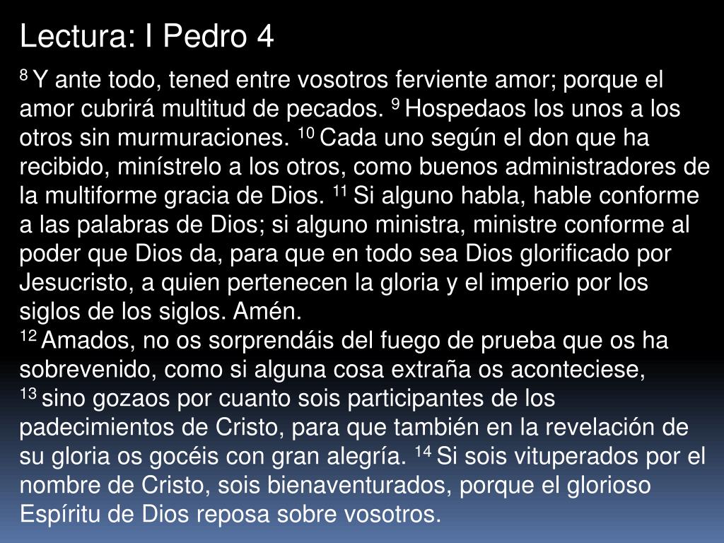 Lectura: I Pedro 4 8 Y ante todo, tened entre vosotros ferviente amor; porque el amor cubrirá multitud de pecados. 9 Hospedaos los unos a los otros sin murmuraciones. 10 Cada uno según el don que ha recibido, minístrelo a los otros, como buenos administradores de la multiforme gracia de Dios. 11 Si alguno habla, hable conforme a las palabras de Dios; si alguno ministra, ministre conforme al poder que Dios da, para que en todo sea Dios glorificado por Jesucristo, a quien pertenecen la gloria y el imperio por los siglos de los siglos. Amén. 12 Amados, no os sorprendáis del fuego de prueba que os ha sobrevenido, como si alguna cosa extraña os aconteciese, 13 sino gozaos por cuanto sois participantes de los padecimientos de Cristo, para que también en la revelación de su gloria os gocéis con gran alegría. 14 Si sois vituperados por el nombre de Cristo, sois bienaventurados, porque el glorioso Espíritu de Dios reposa sobre vosotros.