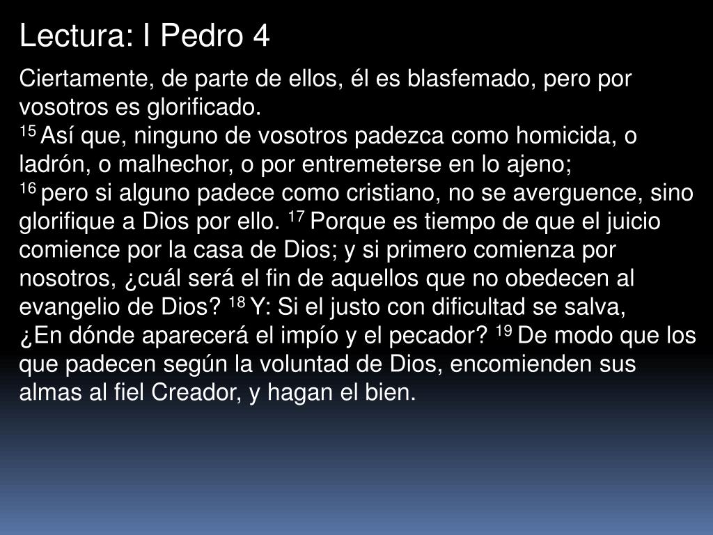 Lectura: I Pedro 4 Ciertamente, de parte de ellos, él es blasfemado, pero por vosotros es glorificado. 15 Así que, ninguno de vosotros padezca como homicida, o ladrón, o malhechor, o por entremeterse en lo ajeno; 16 pero si alguno padece como cristiano, no se averguence, sino glorifique a Dios por ello. 17 Porque es tiempo de que el juicio comience por la casa de Dios; y si primero comienza por nosotros, ¿cuál será el fin de aquellos que no obedecen al evangelio de Dios? 18 Y: Si el justo con dificultad se salva,¿En dónde aparecerá el impío y el pecador? 19 De modo que los que padecen según la voluntad de Dios, encomienden sus almas al fiel Creador, y hagan el bien.