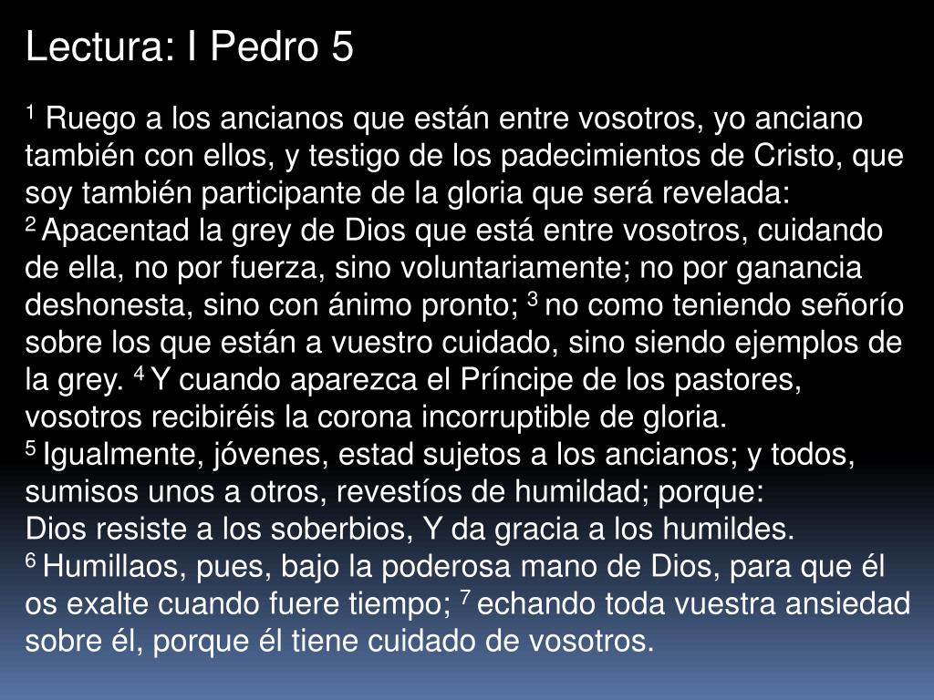 Lectura: I Pedro 5 1 Ruego a los ancianos que están entre vosotros, yo anciano también con ellos, y testigo de los padecimientos de Cristo, que soy también participante de la gloria que será revelada: 2 Apacentad la grey de Dios que está entre vosotros, cuidando de ella, no por fuerza, sino voluntariamente; no por ganancia deshonesta, sino con ánimo pronto; 3 no como teniendo señorío sobre los que están a vuestro cuidado, sino siendo ejemplos de la grey. 4 Y cuando aparezca el Príncipe de los pastores, vosotros recibiréis la corona incorruptible de gloria. 5 Igualmente, jóvenes, estad sujetos a los ancianos; y todos, sumisos unos a otros, revestíos de humildad; porque:Dios resiste a los soberbios, Y da gracia a los humildes. 6 Humillaos, pues, bajo la poderosa mano de Dios, para que él os exalte cuando fuere tiempo; 7 echando toda vuestra ansiedad sobre él, porque él tiene cuidado de vosotros.