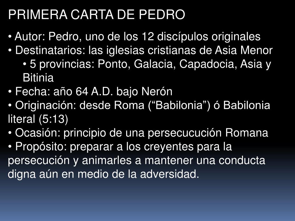 PRIMERA CARTA DE PEDRO • Autor: Pedro, uno de los 12 discípulos originales • Destinatarios: las iglesias cristianas de Asia Menor • 5 provincias: Ponto, Galacia, Capadocia, Asia y Bitinia • Fecha: año 64 A.D. bajo Nerón • Originación: desde Roma (“Babilonia”) ó Babilonia literal (5:13) • Ocasión: principio de una persecucución Romana • Propósito: preparar a los creyentes para la persecución y animarles a mantener una conducta digna aún en medio de la adversidad.