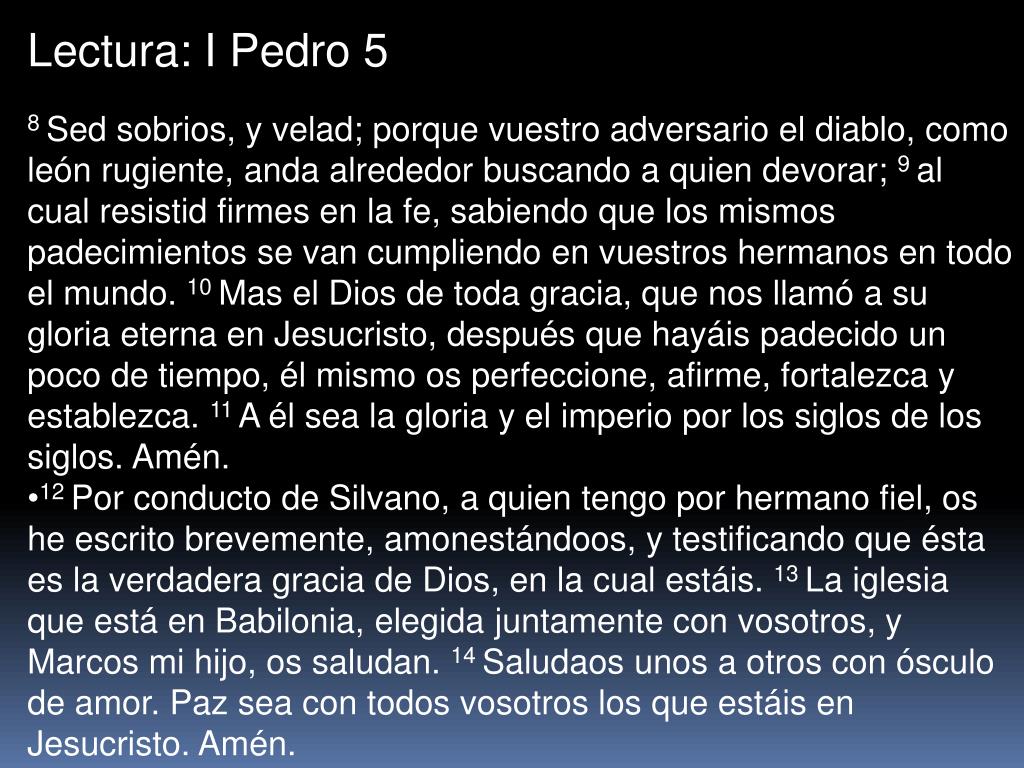 Lectura: I Pedro 5 • 8 Sed sobrios, y velad; porque vuestro adversario el diablo, como león rugiente, anda alrededor buscando a quien devorar; 9 al cual resistid firmes en la fe, sabiendo que los mismos padecimientos se van cumpliendo en vuestros hermanos en todo el mundo. 10 Mas el Dios de toda gracia, que nos llamó a su gloria eterna en Jesucristo, después que hayáis padecido un poco de tiempo, él mismo os perfeccione, afirme, fortalezca y establezca. 11 A él sea la gloria y el imperio por los siglos de los siglos. Amén. • 12 Por conducto de Silvano, a quien tengo por hermano fiel, os he escrito brevemente, amonestándoos, y testificando que ésta es la verdadera gracia de Dios, en la cual estáis. 13 La iglesia que está en Babilonia, elegida juntamente con vosotros, y Marcos mi hijo, os saludan. 14 Saludaos unos a otros con ósculo de amor. Paz sea con todos vosotros los que estáis en Jesucristo. Amén.