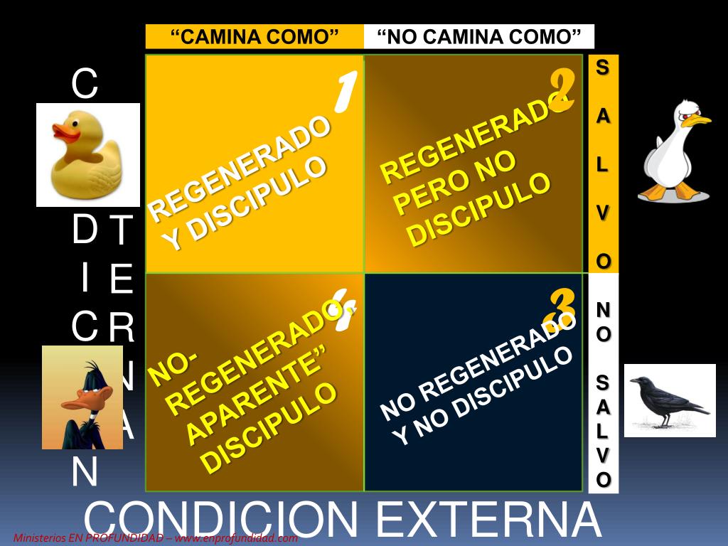 “CAMINA COMO” “NO CAMINA COMO” 2 1 CONDI C ION S A L V O IN T ERNA REGENERADO PERO NO DISCIPULO REGENERADO Y DISCIPULO 4 3 NO SALVO NO-REGENERADO, APARENTE” DISCIPULO NO REGENERADO Y NO DISCIPULO CONDICION EXTERNA