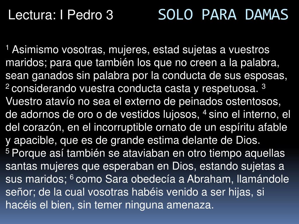SOLO PARA DAMAS Lectura: I Pedro 3 1 Asimismo vosotras, mujeres, estad sujetas a vuestros maridos; para que también los que no creen a la palabra, sean ganados sin palabra por la conducta de sus esposas, 2 considerando vuestra conducta casta y respetuosa. 3 Vuestro atavío no sea el externo de peinados ostentosos, de adornos de oro o de vestidos lujosos, 4 sino el interno, el del corazón, en el incorruptible ornato de un espíritu afable y apacible, que es de grande estima delante de Dios. 5 Porque así también se ataviaban en otro tiempo aquellas santas mujeres que esperaban en Dios, estando sujetas a sus maridos; 6 como Sara obedecía a Abraham, llamándole señor; de la cual vosotras habéis venido a ser hijas, si hacéis el bien, sin temer ninguna amenaza.