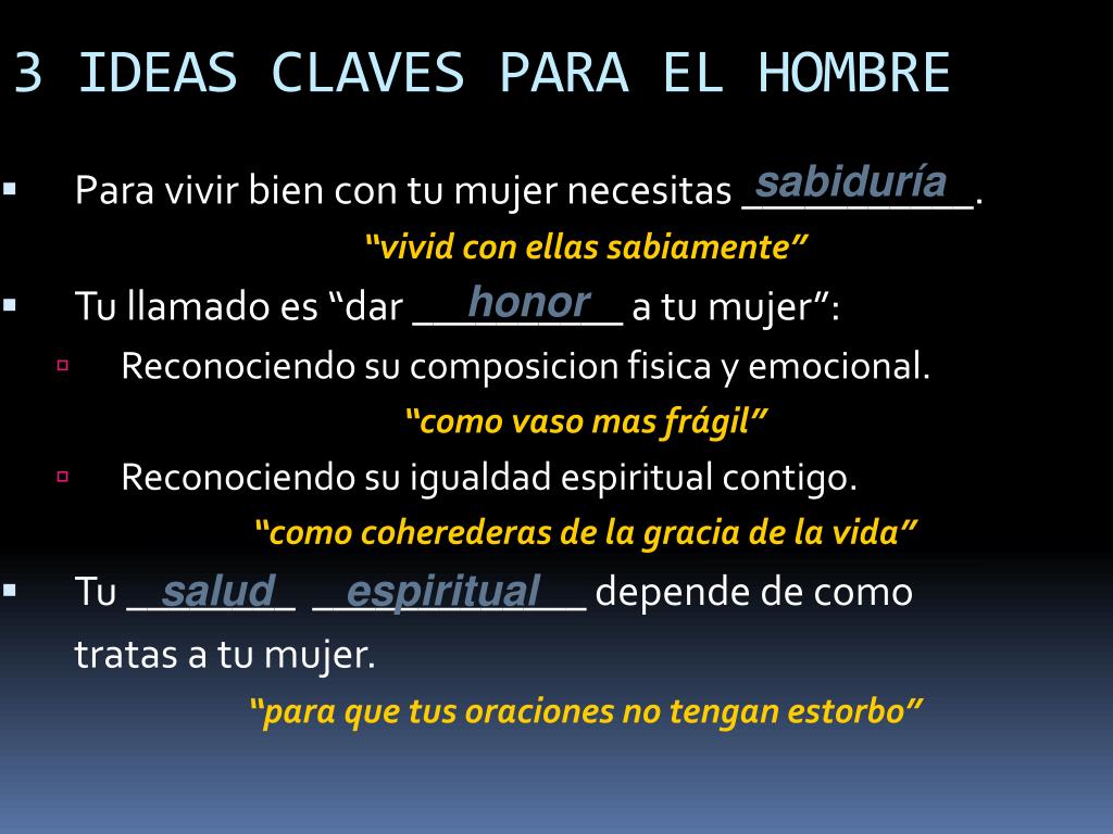 SOLO PARA HOMBRES Lectura: I Pedro 3 7 Vosotros, maridos, igualmente, vivid con ellas sabiamente, dando honor a la mujer como a vaso más frágil, y como a coherederas de la gracia de la vida, para que vuestras oraciones no tengan estorbo.