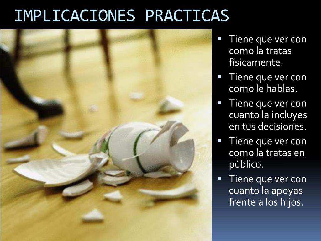 IMPLICACIONES PRACTICAS • Tiene que ver con como la tratas físicamente. • Tiene que ver con como le hablas. • Tiene que ver con cuanto la incluyes en tus decisiones. • Tiene que ver con como la tratas en público. • Tiene que ver con cuanto la apoyas frente a los hijos.