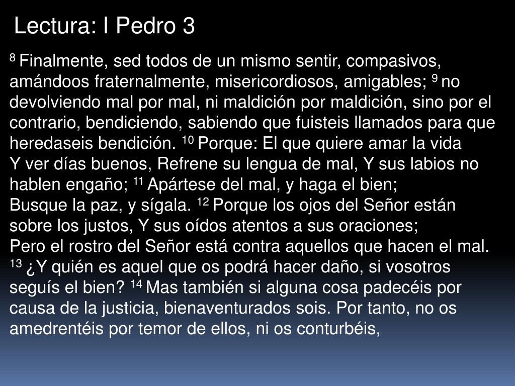 Lectura: I Pedro 3 8 Finalmente, sed todos de un mismo sentir, compasivos, amándoos fraternalmente, misericordiosos, amigables; 9 no devolviendo mal por mal, ni maldición por maldición, sino por el contrario, bendiciendo, sabiendo que fuisteis llamados para que heredaseis bendición. 10 Porque: El que quiere amar la vidaY ver días buenos, Refrene su lengua de mal, Y sus labios no hablen engaño; 11 Apártese del mal, y haga el bien;Busque la paz, y sígala. 12 Porque los ojos del Señor están sobre los justos, Y sus oídos atentos a sus oraciones;Pero el rostro del Señor está contra aquellos que hacen el mal. 13 ¿Y quién es aquel que os podrá hacer daño, si vosotros seguís el bien? 14 Mas también si alguna cosa padecéis por causa de la justicia, bienaventurados sois. Por tanto, no os amedrentéis por temor de ellos, ni os conturbéis,