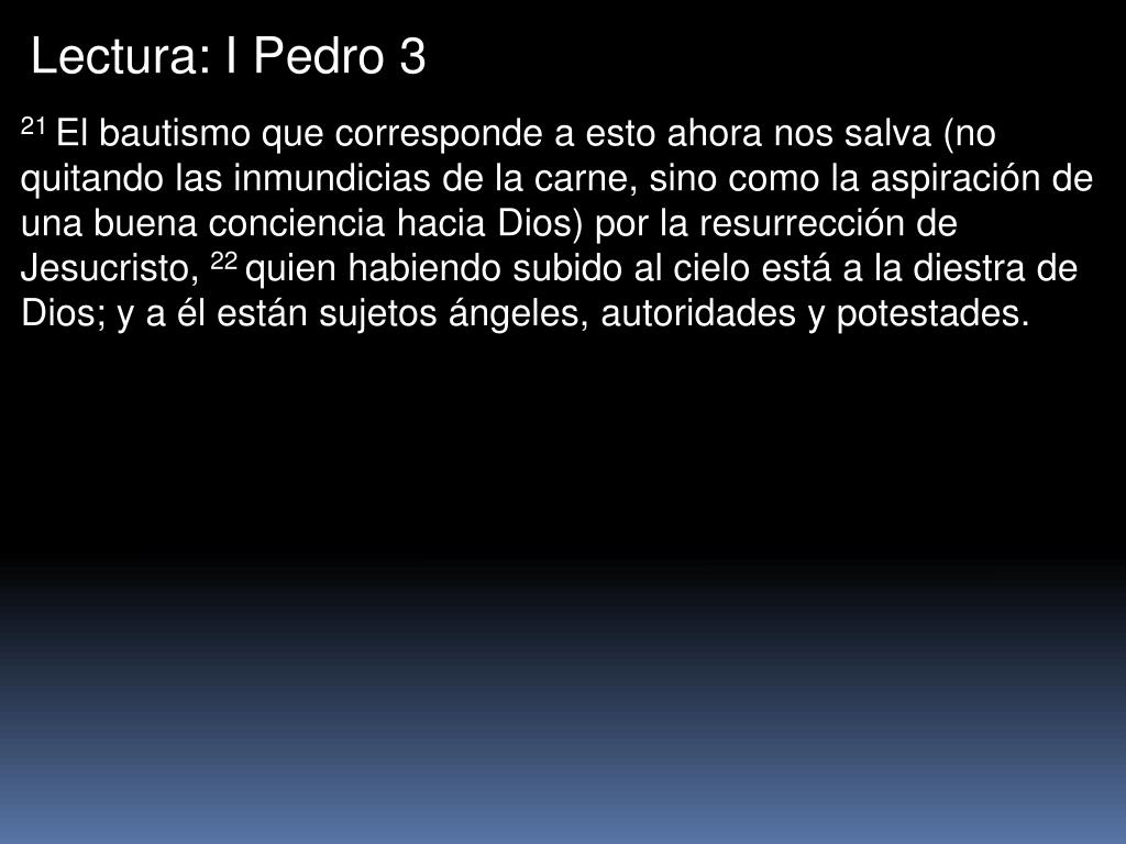 Lectura: I Pedro 3 21 El bautismo que corresponde a esto ahora nos salva (no quitando las inmundicias de la carne, sino como la aspiración de una buena conciencia hacia Dios) por la resurrección de Jesucristo, 22 quien habiendo subido al cielo está a la diestra de Dios; y a él están sujetos ángeles, autoridades y potestades.