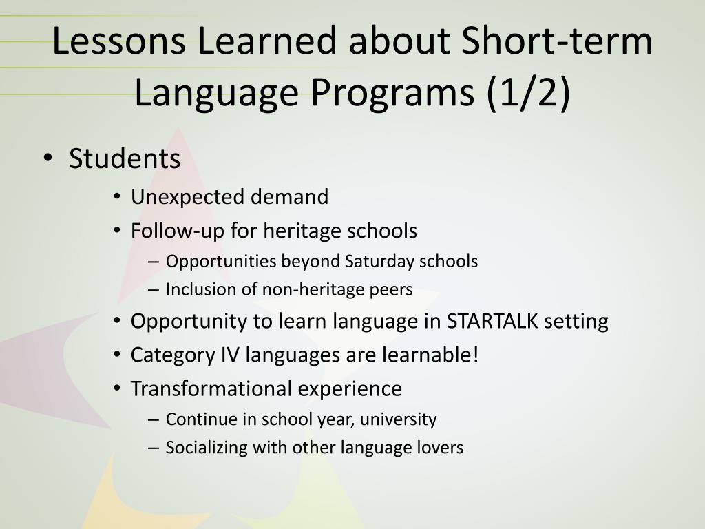 Lessons Learned about Short-term Language Programs (1/2) • Students • Unexpected demand • Follow-up for heritage schools • Opportunities beyond Saturday schools • Inclusion of non-heritage peers • Opportunity to learn language in STARTALK setting • Category IV languages are learnable! • Transformational experience • Continue in school year, university • Socializing with other language lovers