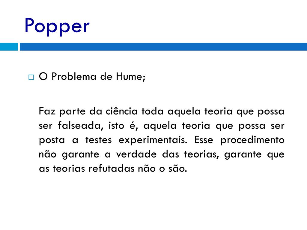 Popper • O Problema de Hume; Faz parte da ciência toda aquela teoria que possa ser falseada, isto é, aquela teoria que possa ser posta a testes experimentais. Esse procedimento não garante a verdade das teorias, garante que as teorias refutadas não o são.