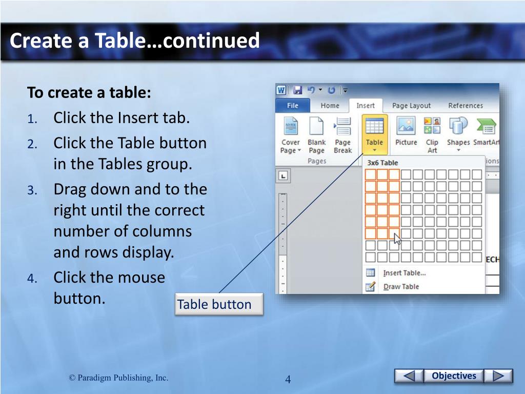 Create a Table…continued Use these options to specify the number of columns and rows.