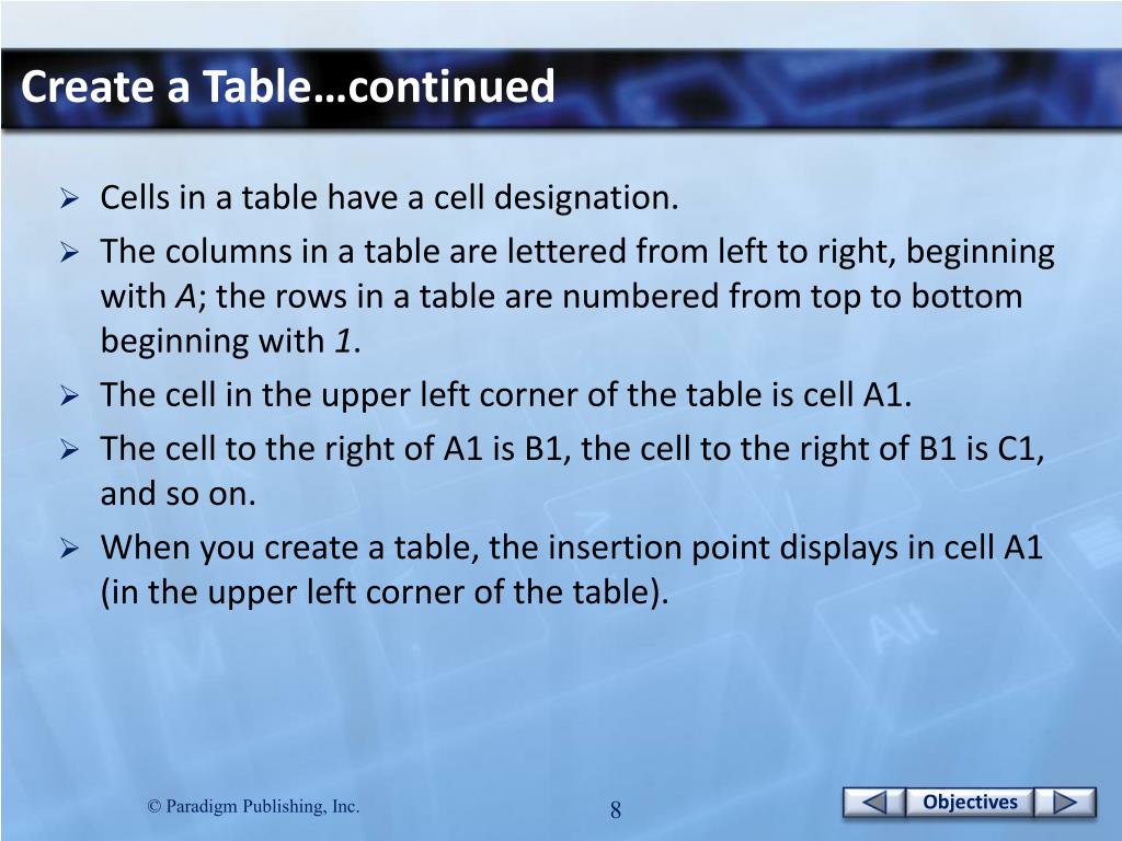 Objectives. Chapter 13: Creating Tables Performance Objectives. Create a Table Select Cells CHECKPOINT 1 Change the Table Design Draw a Table Insert an Excel Spreadsheet Insert a Quick Table CHECKPOINT 2. Create a Table. A table is made up of information boxes called cells.