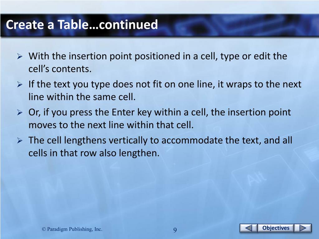 Create a Table…continued • With the insertion point positioned in a cell, type or edit the cell’s contents. • If the text you type does not fit on one line, it wraps to the next line within the same cell. • Or, if you press the Enter key within a cell, the insertion point moves to the next line within that cell. • The cell lengthens vertically to accommodate the text, and all cells in that row also lengthen.