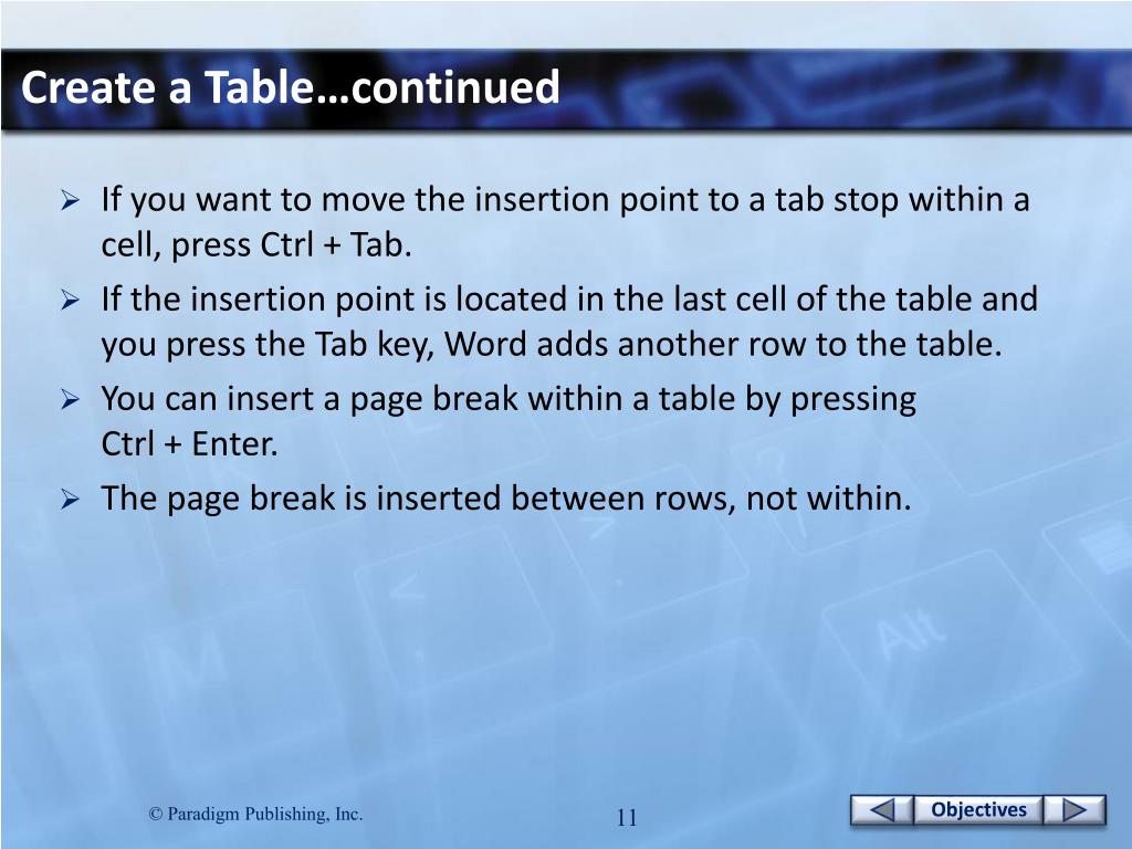 Create a Table…continued • If you want to move the insertion point to a tab stop within a cell, press Ctrl + Tab. • If the insertion point is located in the last cell of the table and you press the Tab key, Word adds another row to the table. • You can insert a page break within a table by pressing Ctrl + Enter. • The page break is inserted between rows, not within.