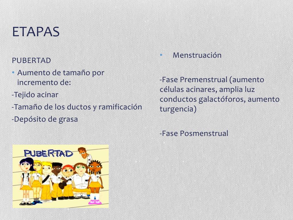 ETAPAS PUBERTAD • Aumento de tamaño por incremento de: -Tejido acinar -Tamaño de los ductos y ramificación -Depósito de grasa • Menstruación -Fase Premenstrual (aumento células acinares, amplia luz conductos galactóforos, aumento turgencia) -Fase Posmenstrual