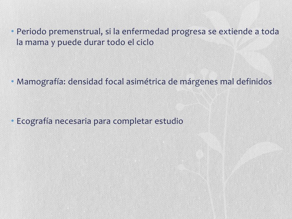 Periodo premenstrual, si la enfermedad progresa se extiende a toda la mama y puede durar todo el ciclo • Mamografía: densidad focal asimétrica de márgenes mal definidos • Ecografía necesaria para completar estudio