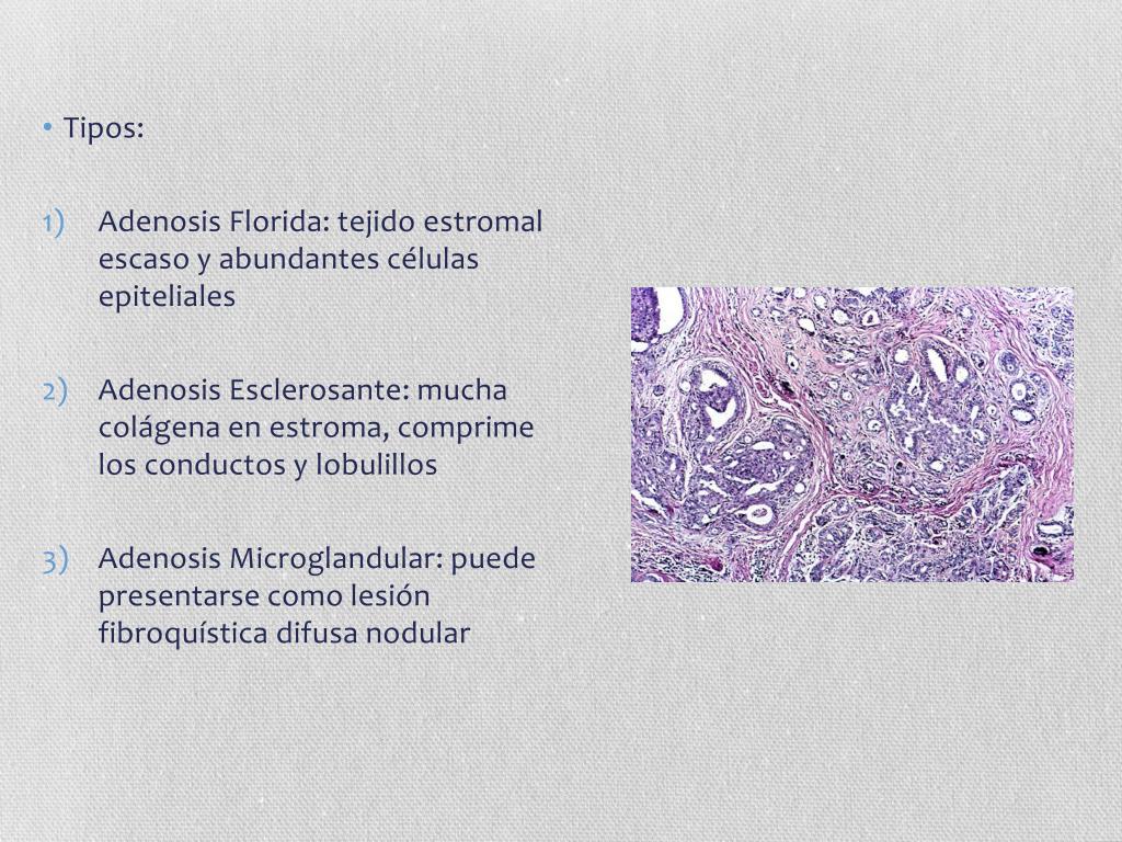 Tipos: • Adenosis Florida: tejido estromal escaso y abundantes células epiteliales • AdenosisEsclerosante: mucha colágena en estroma, comprime los conductos y lobulillos • AdenosisMicroglandular: puede presentarse como lesión fibroquística difusa nodular