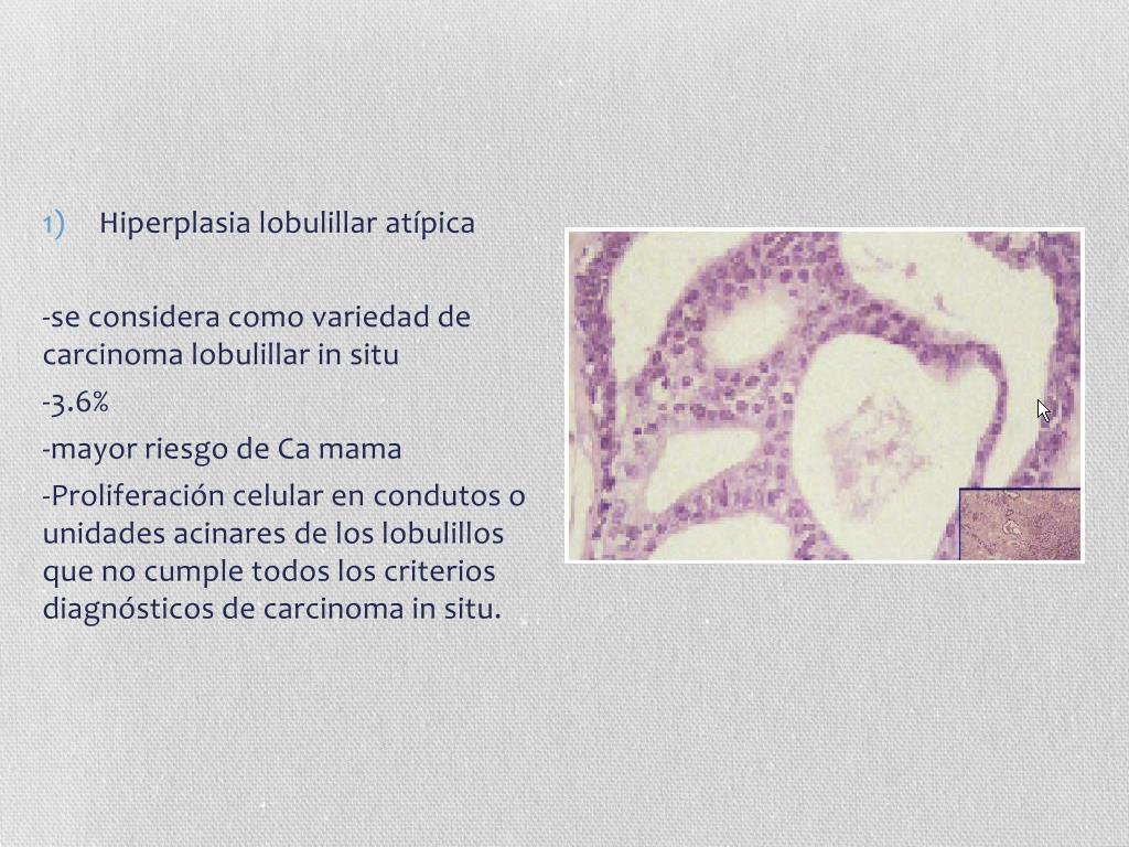 Hiperplasia lobulillaratípica -se considera como variedad de carcinoma lobulillar in situ -3.6% -mayor riesgo de Ca mama -Proliferación celular en condutos o unidades acinares de los lobulillos que no cumple todos los criterios diagnósticos de carcinoma in situ.
