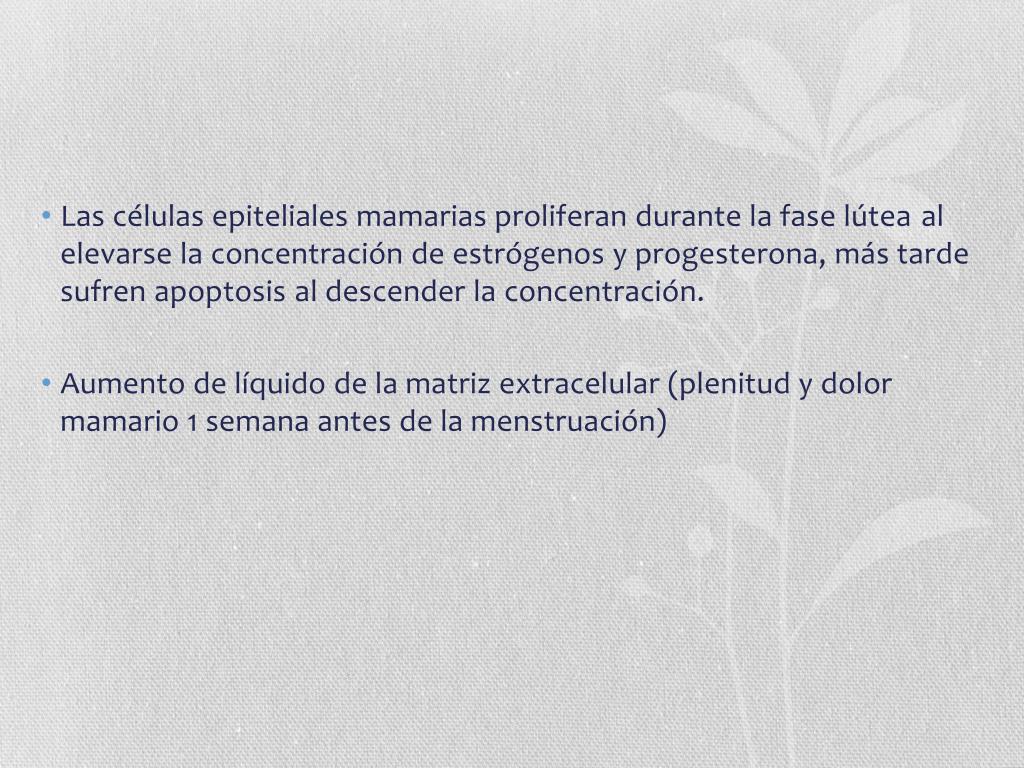 Las células epiteliales mamarias proliferan durante la fase lútea al elevarse la concentración de estrógenos y progesterona, más tarde sufren apoptosis al descender la concentración. • Aumento de líquido de la matriz extracelular (plenitud y dolor mamario 1 semana antes de la menstruación)