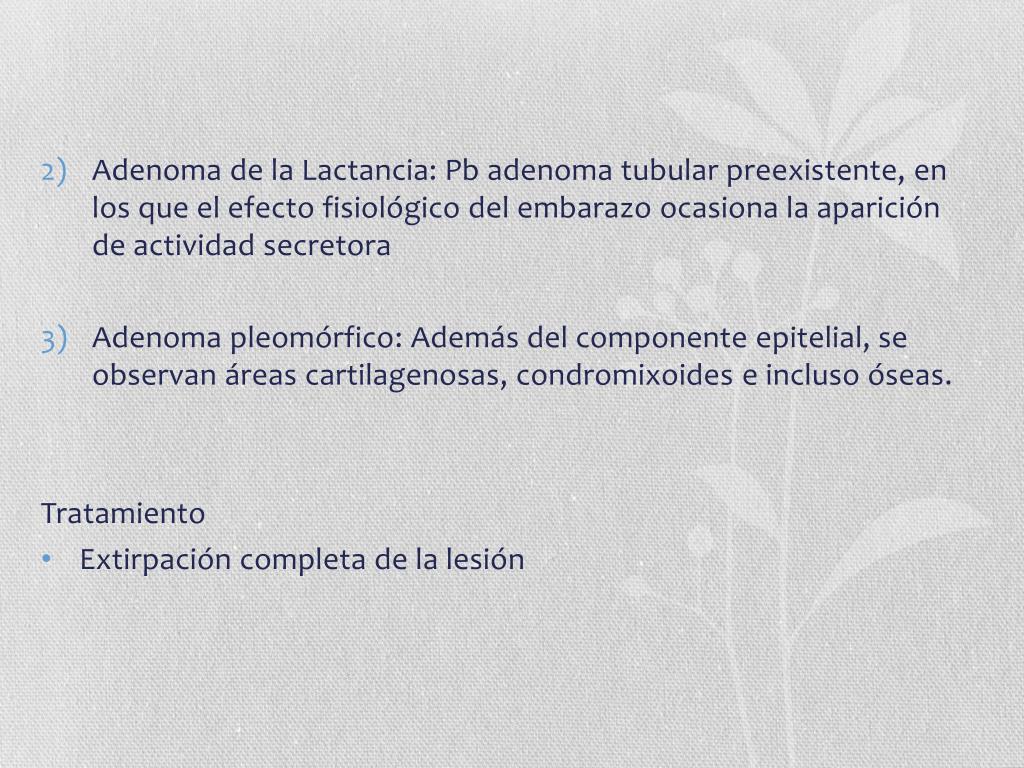 Adenoma de la Lactancia: Pb adenoma tubular preexistente, en los que el efecto fisiológico del embarazo ocasiona la aparición de actividad secretora • Adenoma pleomórfico: Además del componente epitelial, se observan áreas cartilagenosas, condromixoides e incluso óseas. Tratamiento • Extirpación completa de la lesión