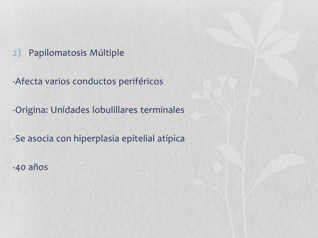 Papilomatosis Múltiple -Afecta varios conductos periféricos -Origina: Unidades lobulillares terminales -Se asocia con hiperplasia epitelial atípica -40 años