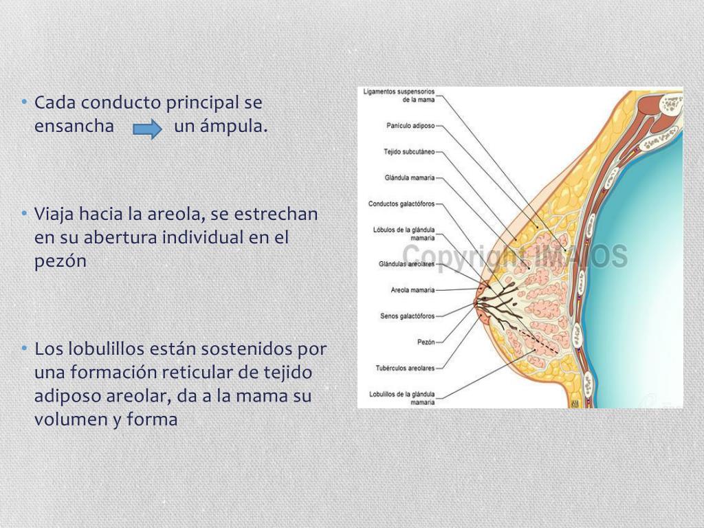 Cada conducto principal se ensancha un ámpula. • Viaja hacia la areola, se estrechan en su abertura individual en el pezón • Los lobulillos están sostenidos por una formación reticular de tejido adiposo areolar, da a la mama su volumen y forma