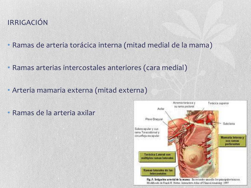 IRRIGACIÓN • Ramas de arteria torácica interna (mitad medial de la mama) • Ramas arterias intercostales anteriores (cara medial) • Arteria mamaria externa (mitad externa) • Ramas de la arteria axilar