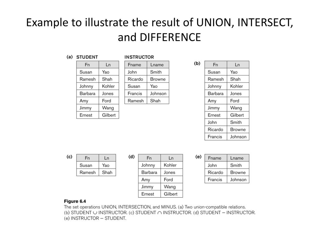 UNION Example • To retrieve the social security numbers of all employees who either work in department 5 or directly supervise an employee who works in department 5 DEP5_EMPS DNO=5 (EMPLOYEE) RESULT1 SSN(DEP5_EMPS) RESULT2(SSN) SUPERSSN(DEP5_EMPS) RESULT RESULT1 RESULT2