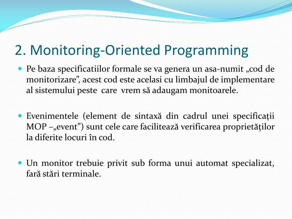 2. Monitoring-Oriented Programming • Pebazaspecificatiilorformale se va genera un asa-numit „cod de monitorizare”, acest cod esteacelasi cu limbajul de implementare al sistemuluipeste care vremsăadaugammonitoarele. • Evenimentele (element de sintaxă din cadruluneispecificații MOP –„event”) suntcele care faciliteazăverificareaproprietăților la diferitelocuriîn cod. • Un monitor trebuieprivit sub forma unui automat specializat, farăstăriterminale.
