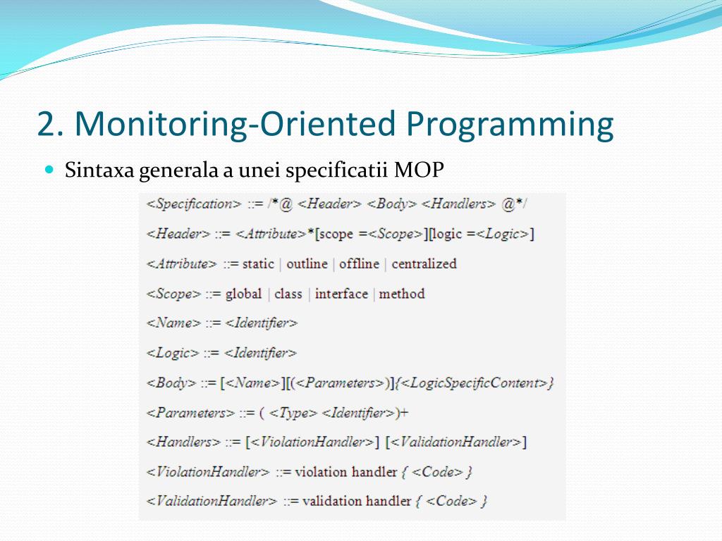 2. Monitoring-Oriented Programming • Prima componentă (header-ul) vacontineinformatiidespreprocesul de monitorizare, generaresiintegrare. Pot fiadăugatesiinformatiiprivitoare la scopulsilogicafolosită la definireaunorproprietati in vedereamonitorizarii. • Încea de a douacomponenta (corpul) proprietatilemonitorizatesuntdeclarate, aceleformulevorfiasociate cu anumite plug-in-urilogice, înconcordanta cu semnaticaformalautilizata. • Ultimacomponentă (handler-ul) estereprezentată de coduldeclarat de programatorpentrucazul in care proprietateaesterespectatasauincalcata.