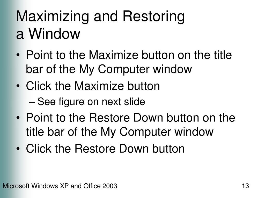 Maximizing and Restoring a Window • Point to the Maximize button on the title bar of the My Computer window • Click the Maximize button • See figure on next slide • Point to the Restore Down button on the title bar of the My Computer window • Click the Restore Down button