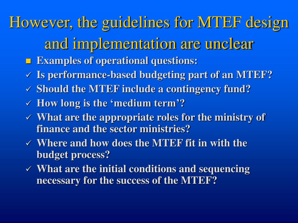 However, the guidelines for MTEF design and implementation are unclear • Examples of operational questions: • Is performance-based budgeting part of an MTEF? • Should the MTEF include a contingency fund? • How long is the ‘medium term’? • What are the appropriate roles for the ministry of finance and the sector ministries? • Where and how does the MTEF fit in with the budget process? • What are the initial conditions and sequencing necessary for the success of the MTEF?
