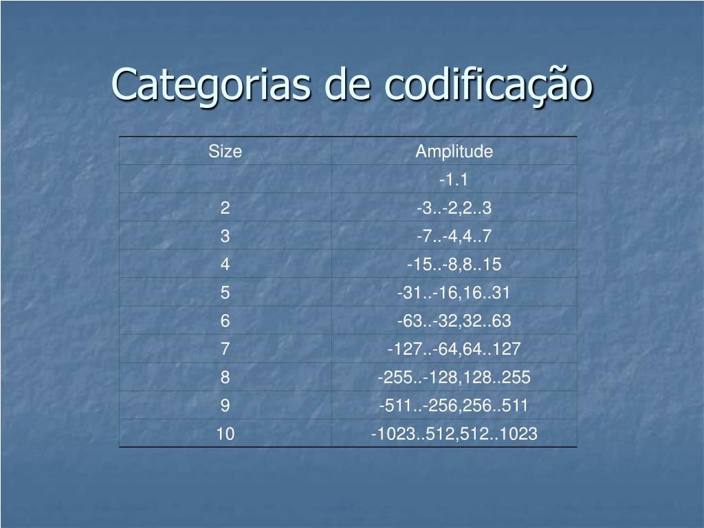 Codificação entrópica • Categorize DC values into SIZE (number of bits needed to represent) and actual bits. • Example: if DC value is 4, 3 bits are needed. • Send off SIZE as Huffman symbol, followed by actual 3 bits. • For AC components two symbols are used: Symbol_1: (skip, SIZE), Symbol_2: actual bits. Symbol_1 (skip, SIZE) is encoded using the Huffman coding, Symbol_2 is not encoded. • Huffman Tables can be custom (sent in header) or default.