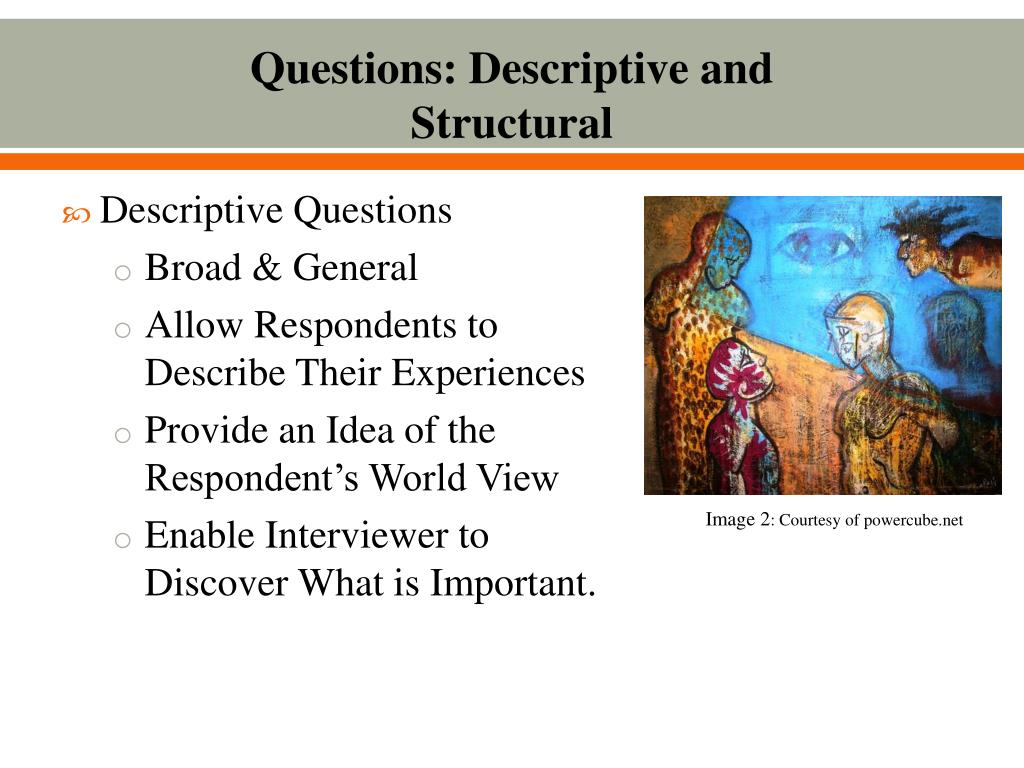 Questions: Descriptive and Structural • Descriptive Questions • Broad & General • Allow Respondents to Describe Their Experiences • Provide an Idea of the Respondent’s World View • Enable Interviewer to Discover What is Important. Image 2: Courtesy of powercube.net