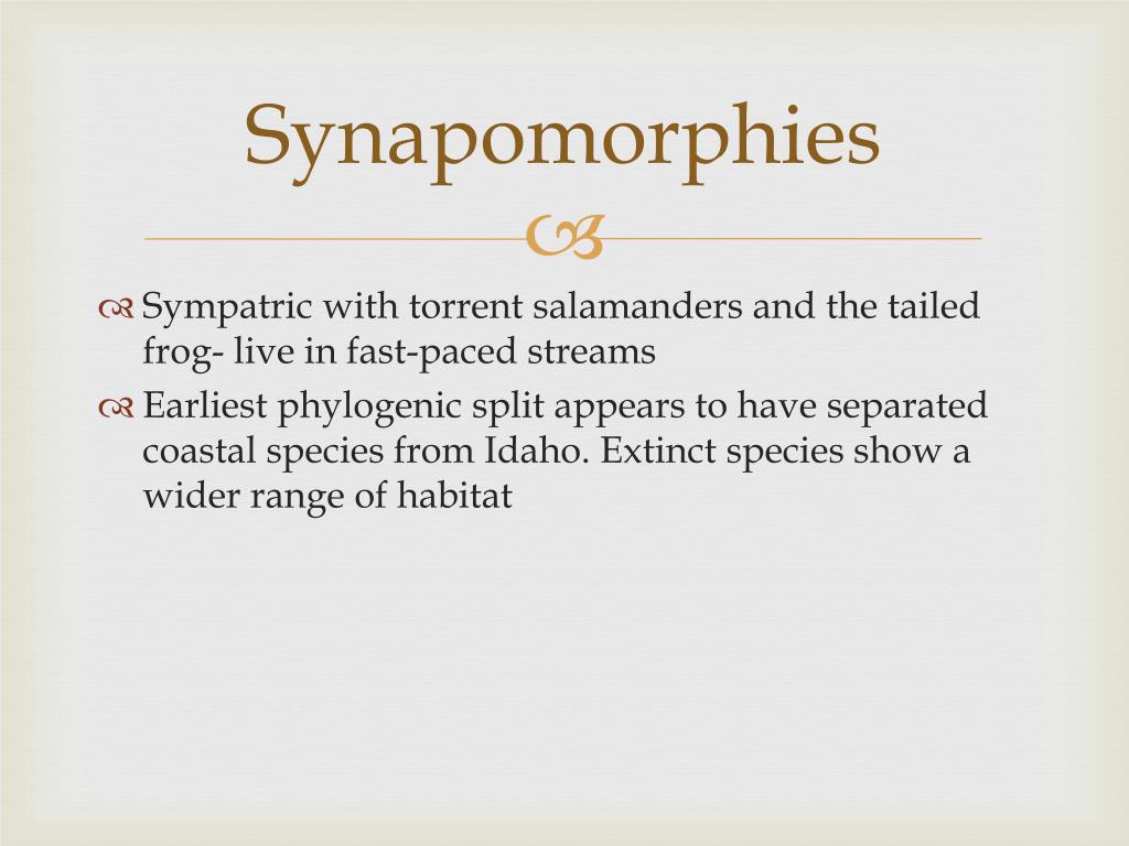 Synapomorphies • Sympatric with torrent salamanders and the tailed frog- live in fast-paced streams • Earliest phylogenic split appears to have separated coastal species from Idaho. Extinct species show a wider range of habitat