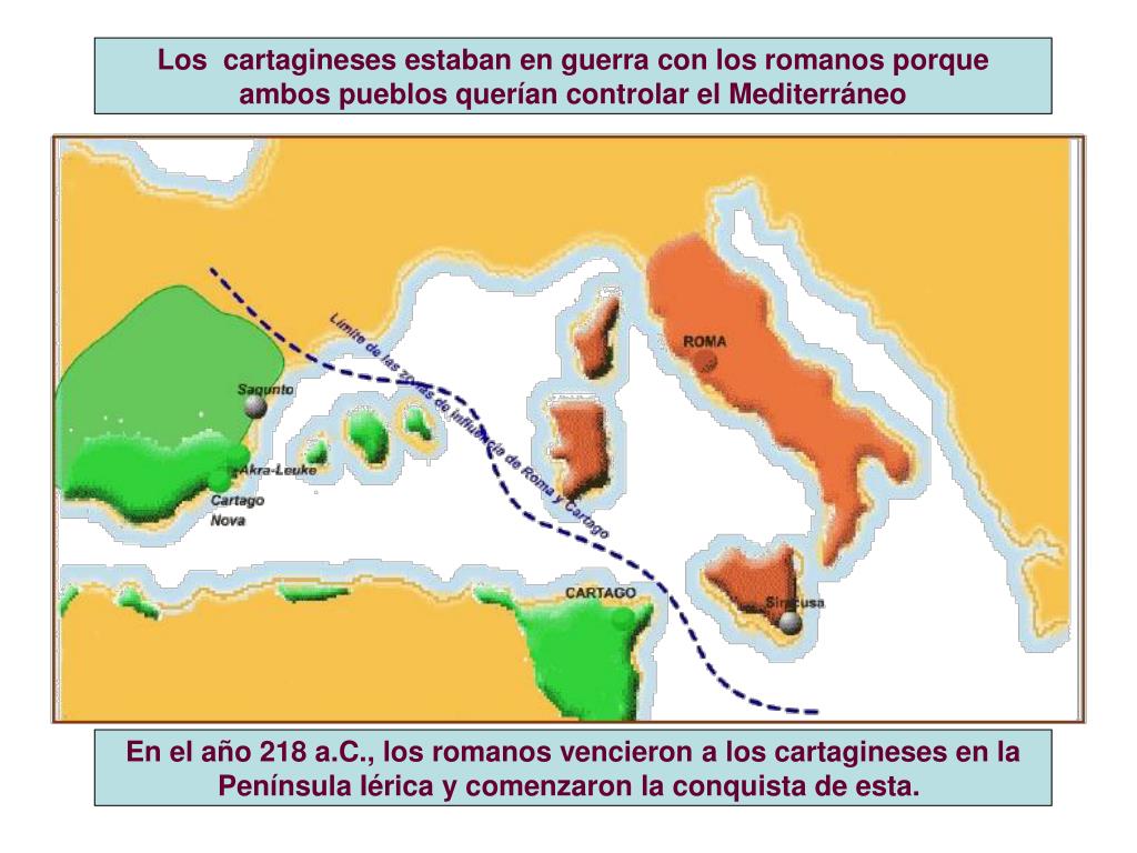 Los cartagineses estaban en guerra con los romanos porque ambos pueblos querían controlar el Mediterráneo En el año 218 a.C., los romanos vencieron a los cartagineses en la Península Iérica y comenzaron la conquista de esta.